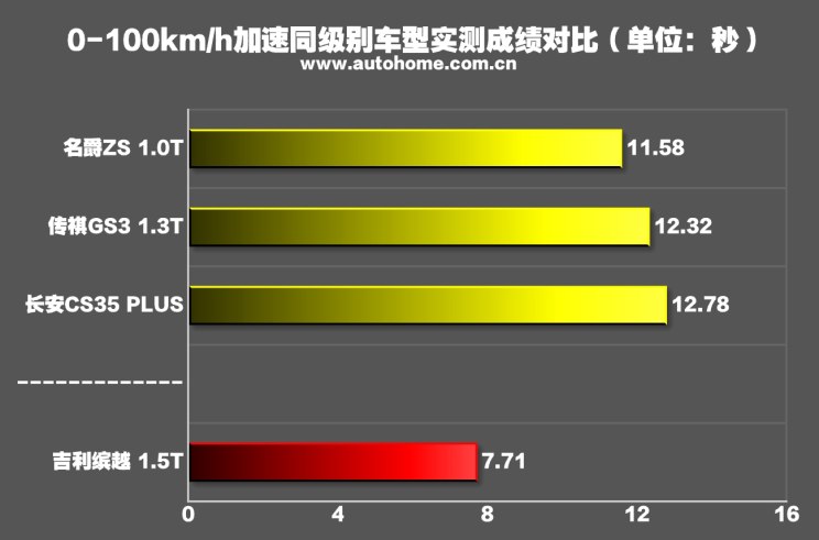 不踩刹车憋转速直接起步时成绩最好,整个加速过程中g值都没有很高,加速感也比较平稳,但是最终的成绩让人惊喜,仅需7.71s就能完成整个加速过程,在同级车型中表现非常突出。