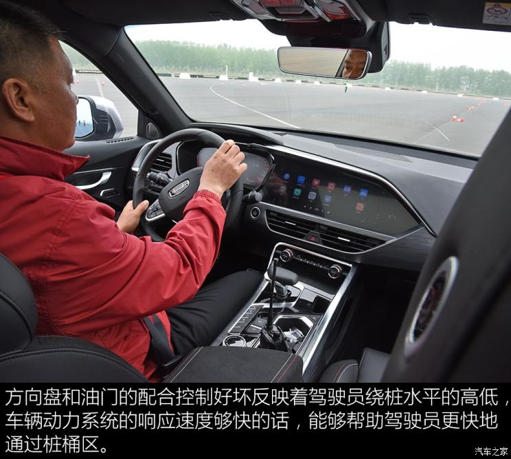 车速超过100km/h后全力制动,偏软的前悬架调校使得车身会有明显的点头现象,但车身姿态还算稳健。金卡纳赛道的前段是一段桩桶区,我驾驶星越以60km/h左右的速度绕桩时,感觉车身侧倾还是较为明显的,这与该车偏软的悬架调校有关,注重舒适性还是这款新车的调校主基调。