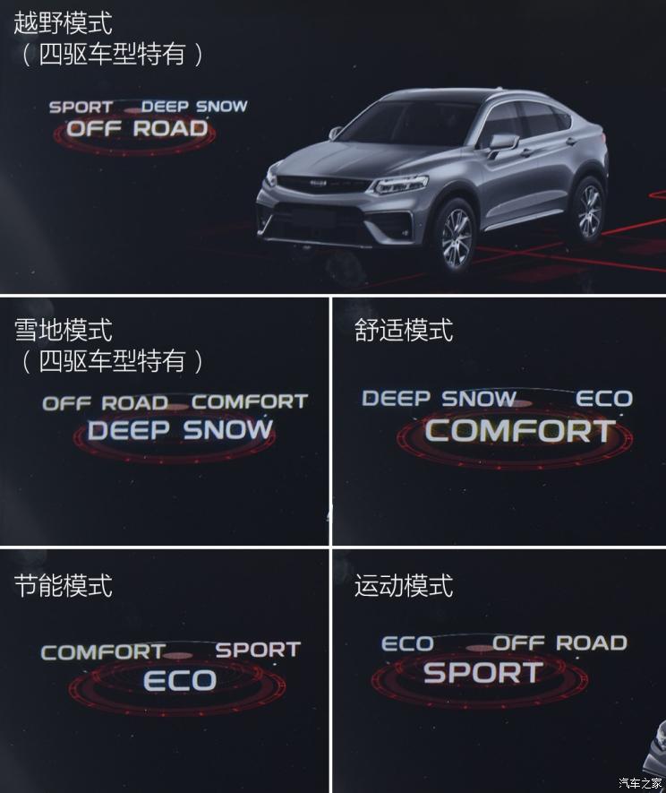 星越采用的是电动助力系统,转向手感较轻。该车的转向响应是比较迅速的,开起来给人以得心应手的感觉。不同的驾驶模式(两驱车型有3种驾驶模式可选,四驱车型则有5种驾驶模式可选)对方向盘转向力度影响不大,但对动力系统输出特性会有明显影响。