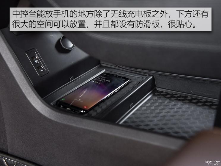 无线充电板的位置非常醒目,上车之后顺手就能把手机放到这儿充电,但植绒面的防滑性能不太好,当驾驶员紧急变线时手机就会滑出去,如果滑到驾驶员脚边的话无形中就增加了不少行车风险,要是能做一些更有效的防滑处理就好了。