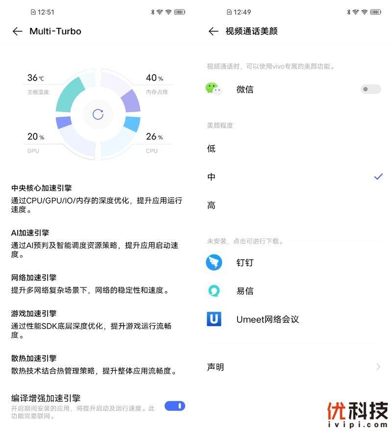 iQOO 5系列搭载Multi-Turbo 4.0系统,通过调整CPU策略、优化框架和recover部分、智能调度资源和利用效率,实现帧率、游戏影音体验、系统流畅性稳定性、应用响应速度和散热等方面的全方位提升,为用户带来流畅稳定的使用体验。并且还支持视频动画美颜功能,支持多档可调,其中包括微信、钉钉、易信、Umeet网络会议等软件均支持该功能。