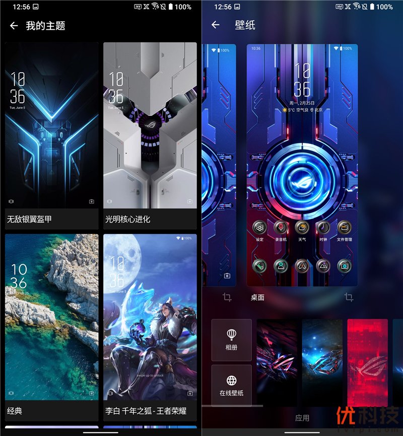 作为一款游戏旗舰机型,ROG游戏手机3系统内置了多款系统主题供用户选择,除了基础的经典、无敌银翼盔甲和光明核心进化之外还具备了无限量子核心以及更具个性化的李白-千年之狐和孙尚香-蔷薇恋人两款王者荣耀系统主题可选。