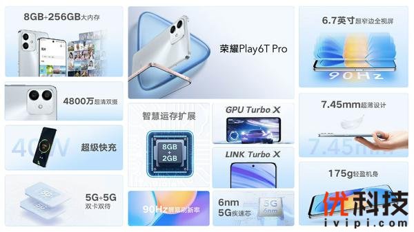 此外,发布会还推出荣耀Play6T系列手机,包括荣耀Play6TPro和荣耀Play6T两款,全系标配8GB大运存,行业率先在1000-1500元档的新机中配置256GB超大内存版本,是5G大内存手机最佳选择。此外,荣耀Play6T系列带来快充和续航双重畅快体验,Pro版本配置40W超级快充,标准版配置5000mAh大电池。在屏幕方面,该系列采用6.7+英寸高刷护眼大屏,通过德国莱茵TÜV低蓝光护眼认证,支持90Hz高刷新率。新品上市荣耀Play6TPro 8+256GB版本售价1599元,于4月7日20:00开启预售, 4月12日10:08正式开售!8+128GB售价1399元,预计4月下旬开售,详情以荣耀商城及各大授权电商信息为准!荣耀Play6T 8+128GB版本售价1199元,8+256GB版本售价1399元,于4月7日20:00开启预售,4月15日10:08正式开售!