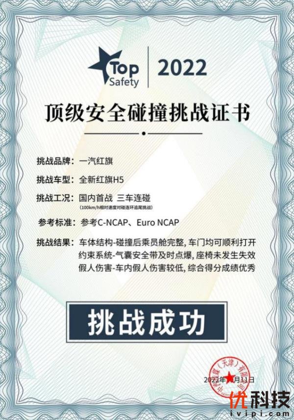 守护安全和健康是底线,也是标准线。一直以来,红旗对待用户安全健康问题都是“锱铢必较”,除了本次的汽车“零甲醛”测试,此前还曾联合中国汽车技术研究中心进行了全新红旗H5三车碰撞挑战,完成了国内100km/h相对速度对碰连环追尾安全测试。这十分考验测试车辆的车身结构强度、约束系统稳定性等被动安全系统的防护能力。碰撞过后,车内假人基本没有损伤,充分展现出了红旗强悍的安全等级。