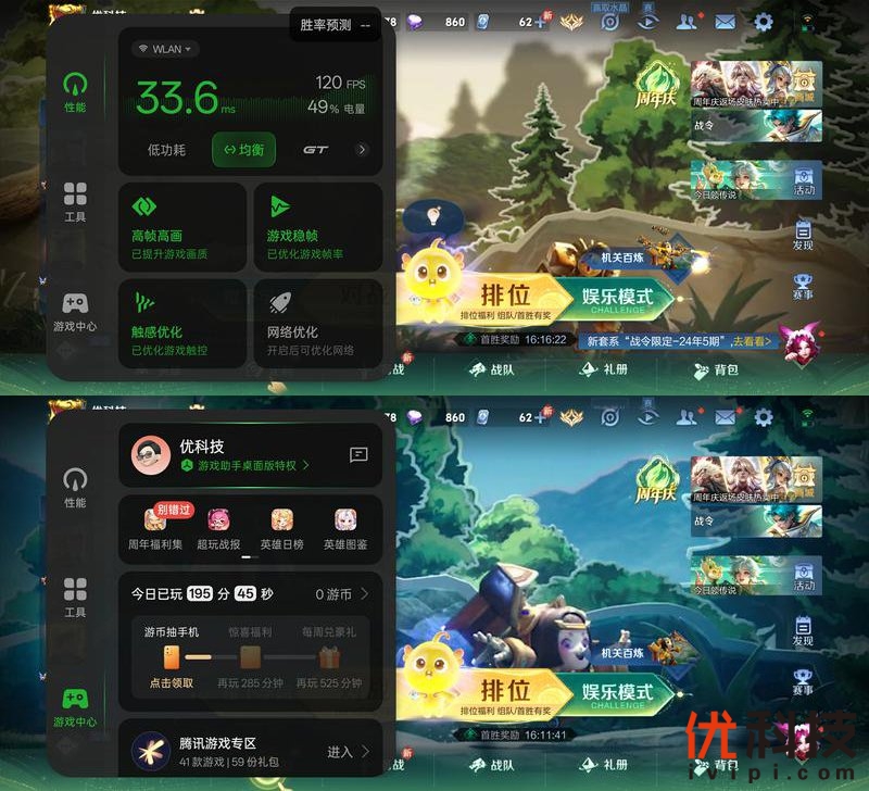 而游戏助手方面,默认游戏页面左上角向内滑即可呼出游戏助手,默认面板显示当下网络延迟和屏幕刷新率,并且支持手机性能模式的切换,用户可根据游戏的要求切换,而下方则是画质和帧率的优化选项,系统会根据不同游戏提供功能选择,同时在游戏中心内还有着多项福利,用户可以选择领取。