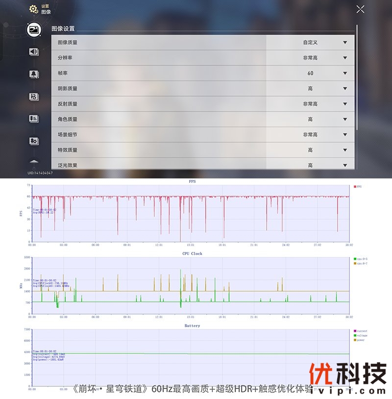 而压轴的则是新晋旗舰手机性能测试标准之称的星铁了,同样在自定义选择60Hz各项最高画质并且开启超级HDR和触感优化功能,进行了日常游戏体验,不同于原神的大场景环境,星铁游戏需要进行多轮场景切换,在切换过程中帧率必不可免地降低,但在30分钟的游戏体验中依旧保持了59.22Hz的平均帧率,并没有出现大规模的连续掉帧状况,依旧是顶级旗舰水准。