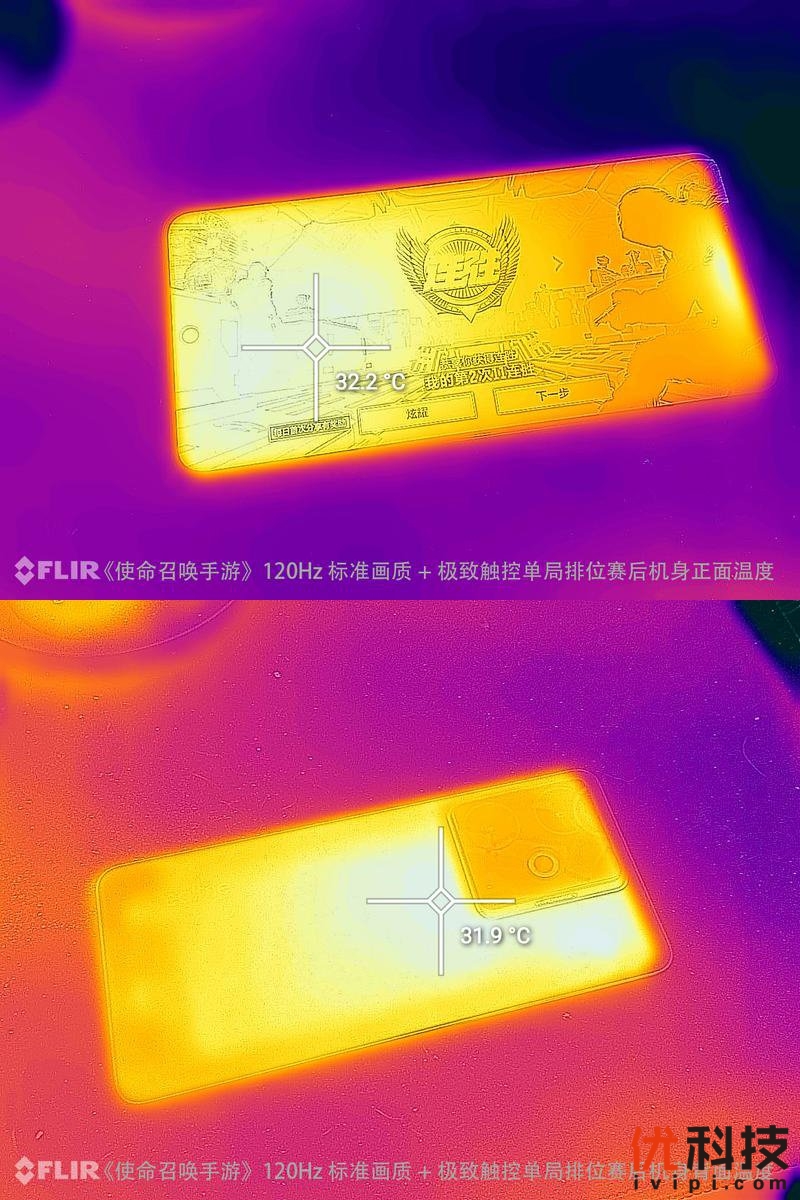 而与和平精英相仿,但单局比赛时间更短的使命召唤手游在选择120Hz标准画质模式下进行单局约为7分钟的比赛后,机身正面最高温度为32.2℃,机背最高温度为31.9℃。