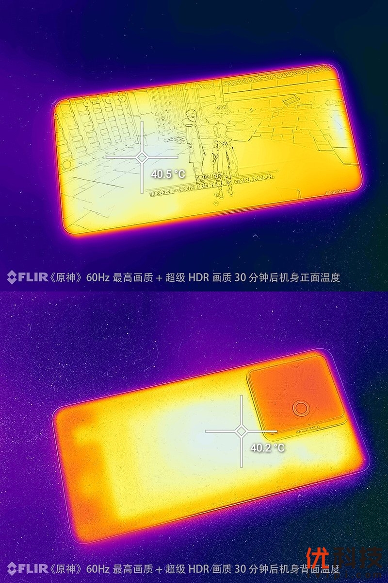 至于曾经作为手机性能参考标准之一的原神,在选择60Hz各项最高画质+超级HDR功能进行30分钟的模拟日常游戏体验后,机身正面最高温度仅为40.5℃,机背最高温度仅为40.2℃。