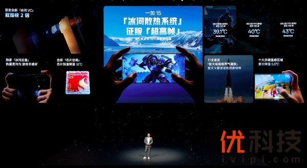 Ultra 级的性能释放,需要强大散热系统的保驾护航。一加 15 搭载全新「冰河散热系统」,采用行业领先的技术理念,在保证了大散热面积的基础上,还带来了更大的散热空间。在独家自研「芯片空调架构」下,一加 15 带来大面积「冰河 VC」,并通过手撕钢结构,减少了 VC 厚度,从而腾出更大的散热空间,实现芯片核心区域降温 18℃,为长时间高负载游戏带来更稳定的帧率表现。此外,一加 15 还创新搭载「游戏手」模型,基于玩家握持姿势,进行针对性的散热与隔热设计,即便面对高负荷游戏场景,一加 15 也能带来“十指战区,持久冰凉”的舒适握持体验。