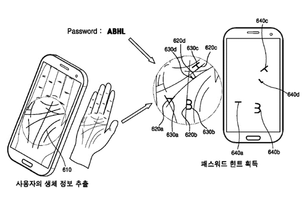 据SamMobile报道,三星在韩国提交了一项专利技术,先是借助前置摄像头对你的手掌扫描或者是拍照作为“敲门砖”,当忘记密码上,和通过核对掌纹的形式认证,之后,图片的纹路上就会出现密码提示。