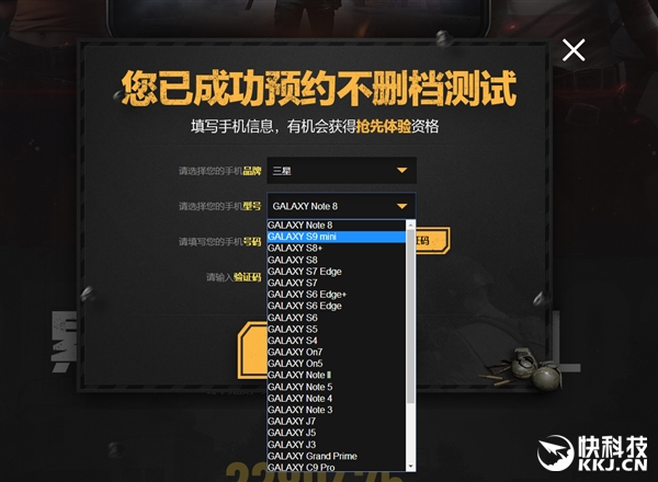 不过有趣的是,腾讯正版吃鸡手游《绝地求生:全军出击》已经开启预约,而在预约成功后的首测资格申请页面,手机型号列表内赫然出现了“Galaxy S9 mini”。