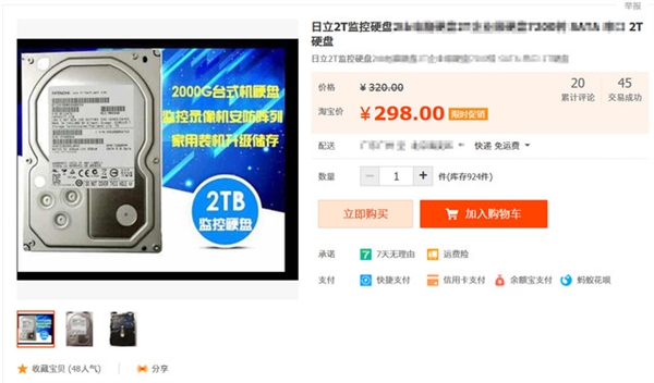 从淘宝的产品描述来看,这款硬盘是日立的原装库存产品,企业级监控用,安全稳定静音,而且商家提供1年包换服务,可能不少玩家一激动就买了,2T空间基本上可以满足大多数玩家的需求了,下面我们就买回这款硬盘,看看300元的2T硬盘靠谱不。