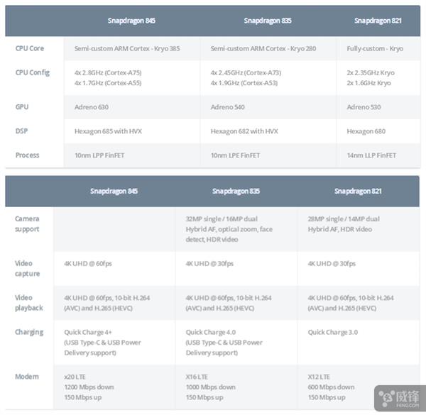 下面分别是Anandtech和AndroidAuthority整理的详细规格表,显示了骁龙845和骁龙835的参数对比细节,还加入了骁龙821比较,一目了然。