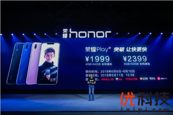 荣耀Play拥有4GB+64GB全网通版,6GB+64GB全网通版两款,两版本售价分别为1999元、2399元,即日起在华为商城、荣耀京东自营旗舰店、天猫荣耀官方旗舰店、苏宁易购荣耀官方旗舰店、唯品会荣耀官方旗舰店和国美荣耀官方旗舰店 六大平台开启预约,6月11日10:08在以上六大平台首发。荣耀Play酷玩版6GB+64GB全网通版2499元,并将在7月限量发售。