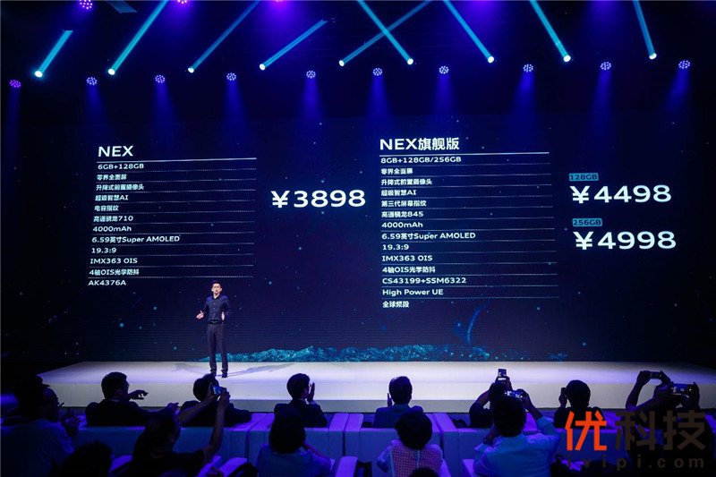 发布会现场,vivo公布了NEX的官方定价。其中,vivo NEX市场售价人民币3898元,NEX旗舰版(128G)4498元,NEX旗舰版(256G) 4998元。
