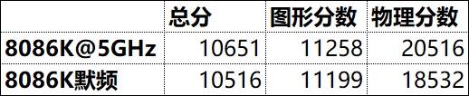 超频到5GHz的8086K,总分为10651,图形分数11258,物理分数为20516。其中以分数提升较为明显,总分与图形分数相比默频变化不大。