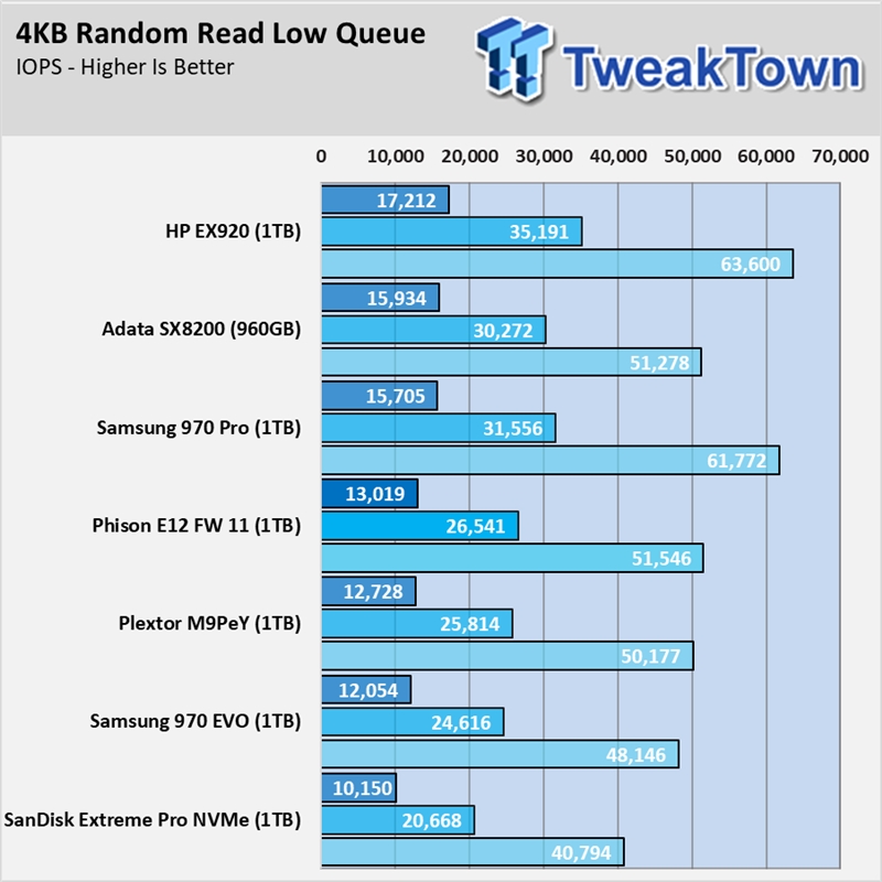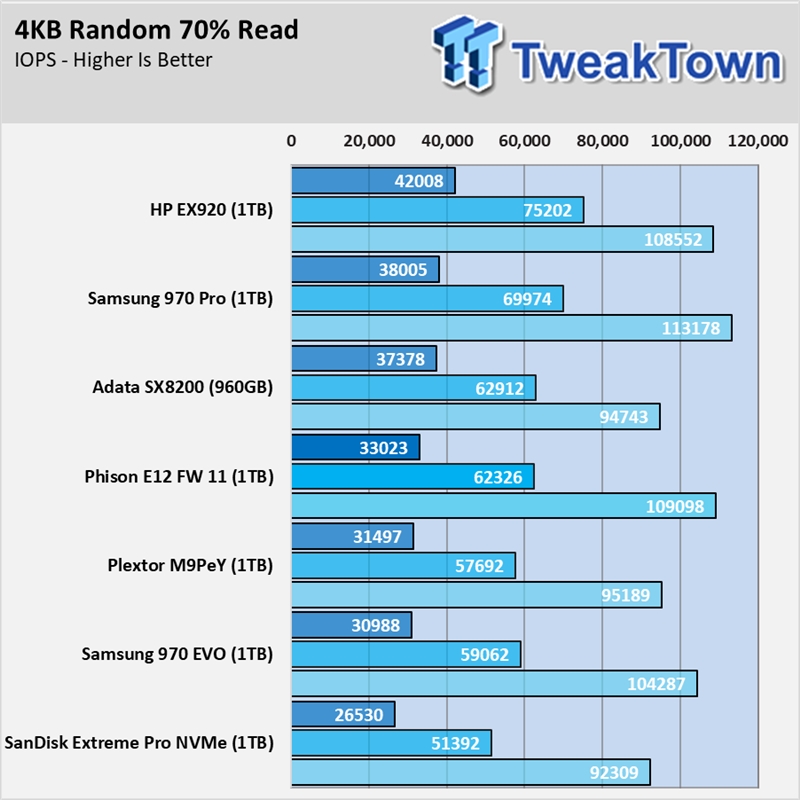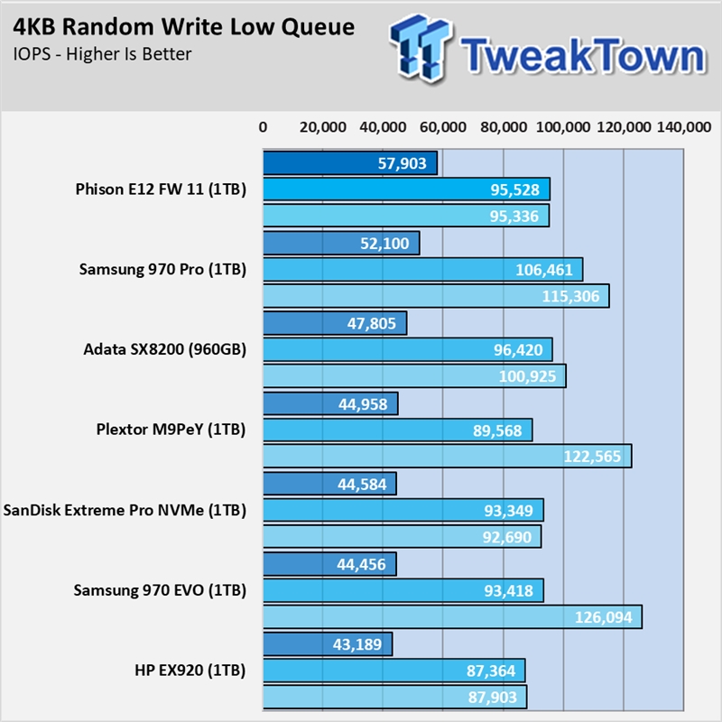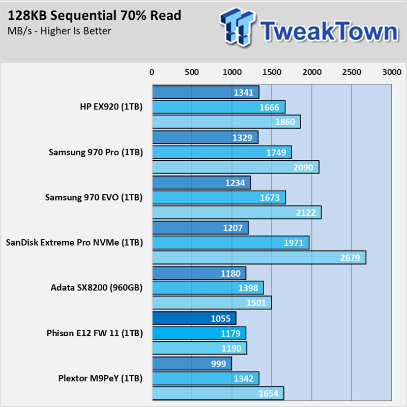 128KB全盘持续写入:竟然一路稳如狗地领先,三星970 PRO都不如。TweakTown称得感谢新固件和冗余容量,但有点太不可思议了,完全黑科技,不禁怀疑测试用的全部都是可压缩数据,E12又开启了数据压缩。