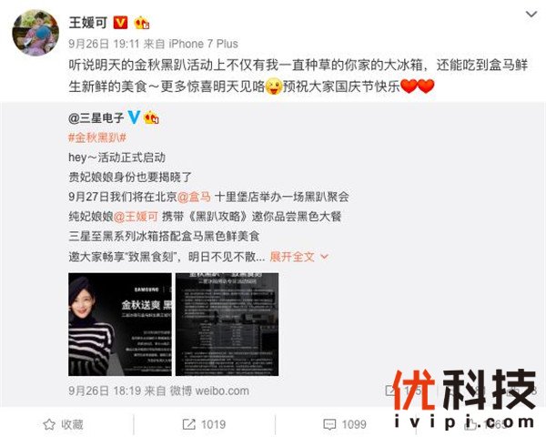 另一方面,除了北京盒马的消费人群,三星冰箱还将目光锁定在粉丝圈层,邀请《延禧攻略》最受欢迎的“纯妃”扮演者王媛可助力#金秋黑趴#营销,扩大事件影响力,拉动粉丝经济。如何撬动目标粉丝,三星冰箱进行了两步走:一、借助明星自媒体发声,吸引目标粉丝关注。二、借助明星推力,直击“黑趴活动”现场,扩散事件影响力。