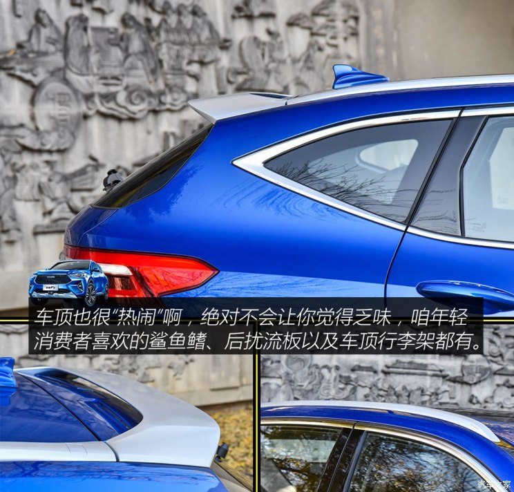 车身侧面是比较标准的SUV造型,不过仔细看它的D柱实际上是比较倾斜的,有点儿Coupe型SUV的味道,但这也仅仅是点到为止而已,要知道真正的F7轿跑版(F7x)已经确有其车,目前申报图已经曝光了。言归正传,看车顶,各种行李架、鲨鱼鳍、扰流板一样不少,整合在一起的效果也是不错。