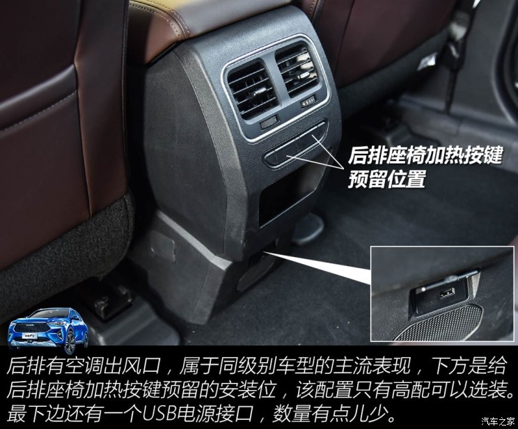 舒适性配置上,这台顶配车型配有四窗一键升降、后排空调出风口和全景天窗,在日常用车中的使用频率还是挺高的。有一个细节,我们之前在体验哈弗F7试装车的时候,后排出风口下方是有后排座椅加热按键的,但上市后的量产车上并没看到这项配置,全系都需要选装。