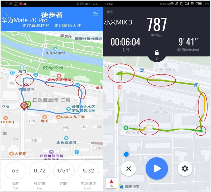 对比两个图可以发现,当我们位于特别高的建筑物旁边时,小米MIX 3信号受到的干扰更大,当我们处在拐角的位置,小米MIX 3的路线图会有错乱的现象,而Mate 20 Pro相对比较准确。