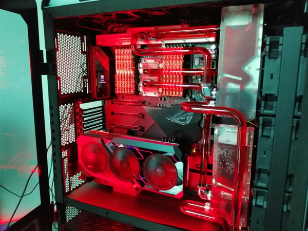 首先看华硕展示的一台样机,刺眼的红色调,基于华硕Dominus Extreme LGA3647主板,奢华的32相供电,EKWB水冷散热,搭配了芝奇的12条皇家戟内存,钻石效果华丽丽,每条16GB,总容量192GB,另有两块华硕ROG Strix RTX 2080 Ti显卡。