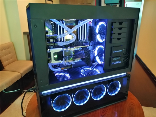 处理器和显卡都是水冷,同时整个机箱有多达16个120mm风扇。