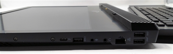 接口有一个雷电3、一个USB 3.1 Type-C(支持VR)、三个USB 3.1 Type-A、一个HDMI 2.0、GbE千兆网口、3.5mm耳机孔、SD读卡器。