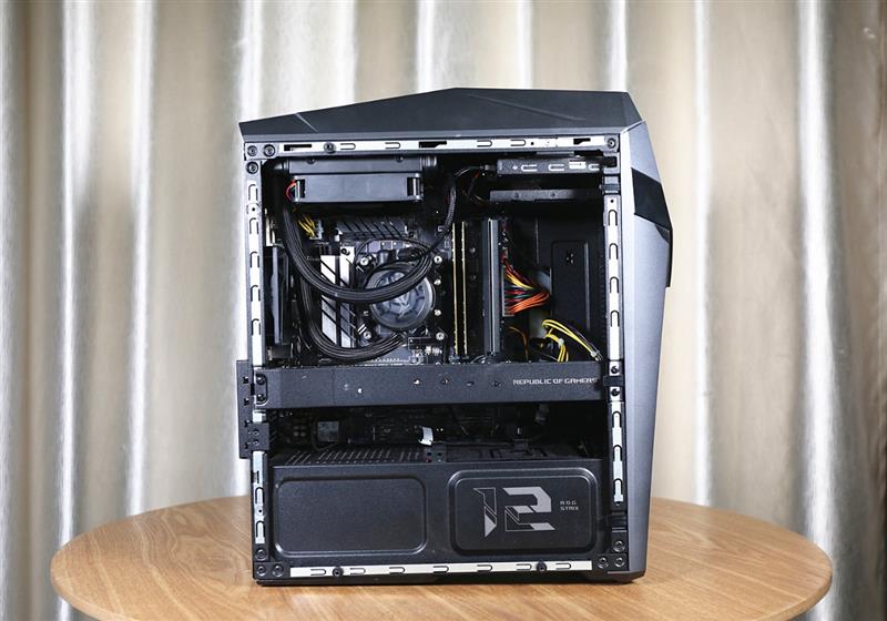 采用涡轮风扇散热的华硕TURBO RTX2080 8G显卡所产生的热量会直接从显卡的I/O挡板出排出机箱外。CPU方面则使用了定制的ROG 120水冷散热器,同样也是直接将CPU的热量从机箱顶部直接排出机箱外。CPU和显卡如此的散热设计,它们的热量都不会存留在机箱内部,使得主机在高负载下也能保持清凉。