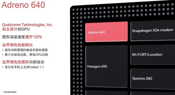 此外,骁龙855的GPU升级为Adreno 640,性能相比上一代提升了20%。Adreno 640继续保持业界领先水平的能效比,所支持的Vulkan 1.1、高动态范围(HDR)和基于物理渲染(PBR)将带来全新水平的逼真游戏体验。