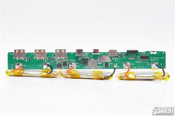 拆开移动电源外壳,只见内部并排放置着三块聚合物电芯以及一块很长的PCB板。