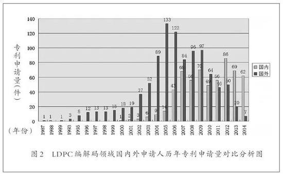 据该文披露,华为早在2001年就开始了LDPC码的专利申请,到了2015年,三星以216件LDPC码专利申请量排名第一,高通以57件专利申请量排名第4,华为以51件专利申请量排名第5。