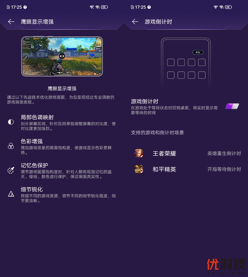 而鹰眼显示增强的加持则更是让吃鸡小伙伴高呼惊喜,通过局部色调映射、色彩增强、记忆色保护和细节锐化,是玩家更能轻松发现草丛中的伏地魔。另外还支持游戏重生开局倒计时功能,在切换出游戏场景之后屏幕上将显示英雄复活倒计时或者开局倒计时。