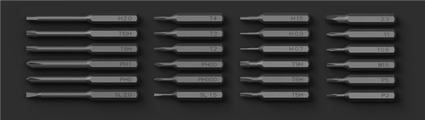 套装内含24枚优质S2工具钢批头,硬度最高可达60HRC,坚韧耐用。24种精密批头型号,贴合主流电子产品及时新小家电拆装需求。其中还有6枚常用批头加长至45mm,从容应对深孔、狭小空间等更多复杂情况。