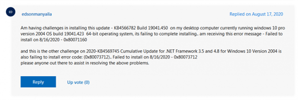 此外,还有一些运行Windows 10五月更新的用户番苦,目前系统版本为Build 19041.423,尝试安装 KB4566782更新来升至Build 19041.450。不过它并不能完成安装,接收到 0x80071160错误。