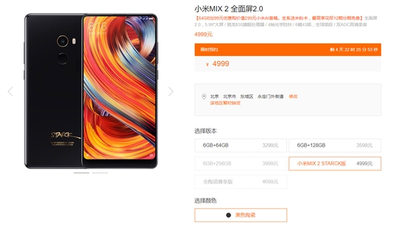 售价方面,小米MIX 2斯塔克限量版售价4999元。同样采用5.99英寸全面屏,拥有5.5英寸的握感,搭载骁龙835处理器,辅以8GB内存和128GB机身存储。