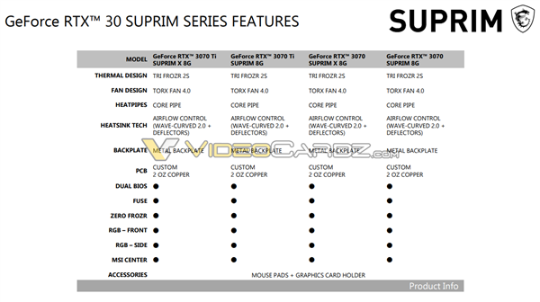 在此之前,已经有厂商迫不及待地将RTX 3080 Ti加入产品列表,今天外媒又曝出了该AIC的产品宣传单,RTX 3080 Ti、RTX 3070 Ti赫然在列,都属于顶级的SUPRIM超龙系列,都有金属背板,RTX 3070 Ti的还有通风镂空。