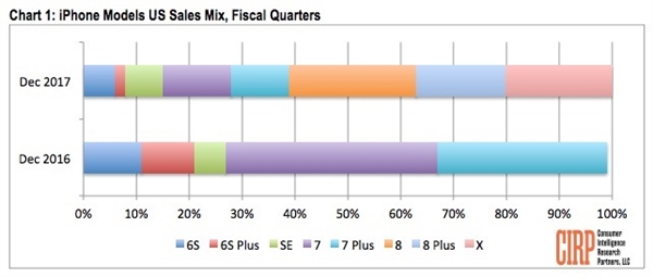 市场调研就够CIRP送出的最新数据显示,去年第四季度iPhone X的实际出货量还是相当可以的,能占到iPhone总销量的五分之一,也就是说每5部iPhone中,就有1部是iPhone X。