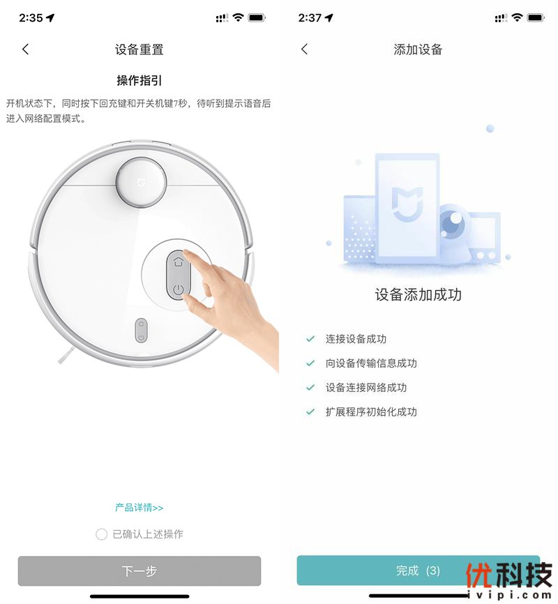 实际体验方面,先要将米家免洗扫拖机器人接入米家APP进行管理,首先要在米家免洗扫拖机器人开机的状态下同时按下回充键和开关机键7秒,在听到语音提示后即可进入到配置模式,整个连接过程还是比较轻松的。