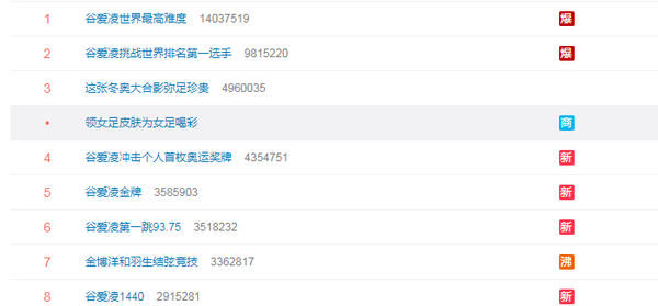 在2月8日举行的冬奥会自由式滑雪大跳台决赛上,谷爱凌第三跳挑战从未尝试过的超高难度动作,结果逆袭夺得冠军。本就传奇的经历,加上夺金,让“谷爱凌”这个名字在微博上红到发烫。当天,微博热搜前十几乎全部和谷爱凌有关。