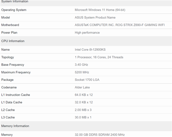 现在,GeekBench 5数据库中出现了i9-12900KS的多个跑分成绩,并确认基准频率为3.4GHz,不过加速频率只检测到5.2GHz——这还是i9-12900K的水平。