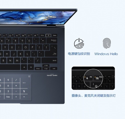 灵耀14 2022水墨蓝特创NumberPad数字触控板二合一,面对大量数字输入任务时操作更便捷;电源键集成指纹识别,一键开机、解锁、登录,无需输入密码和其他操作,并支持一键屏蔽摄像头和麦克风,安全更安心;搭载2x6W大功率立体声扬声器,音量可达常规扬声器的350%,配合杜比全景声和Harman Kardon音响专家认证音效,视听结合带来沉浸式影音体验。