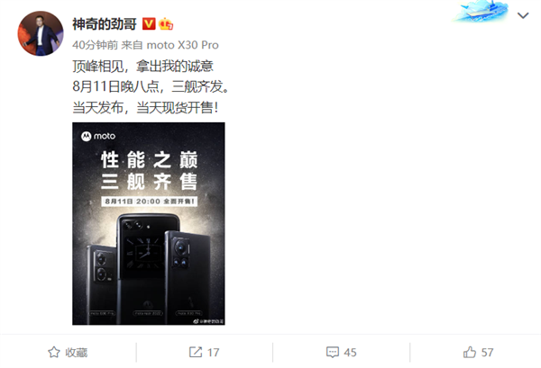 另外,联想中国区手机业务部总经理 陈劲表示,8月11日20:00,三舰齐发,当天发布,当天现货开售。预热海报显示:“性能之巅,三舰齐售”。