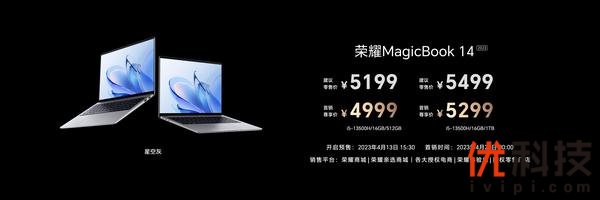 荣耀MagicBook 14 2023款,i5-13500H/16GB/512GB版售价5199元,首销优惠价4999元;i5-13500H/16GB/1TB版售价5499元,首销优惠价5299元;