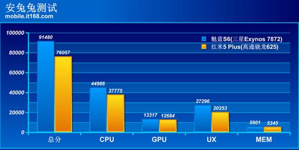 安兔兔测试可以看到魅蓝S6能跑出91480分的高分,这个分数要比使用高通骁龙625的红米5 Plus高出1万多分,得益于Exynos 7872的双核A73大核,带来性能的提升,可以看到主要领先的是Exynos 7872的CPU性能和UX性能,而GPU性能Exynos 7872和高通骁龙625相差不大。