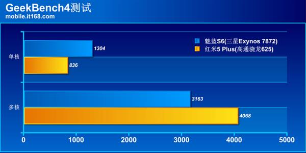 GeekBench的成绩可以看到魅蓝S6采用的Exynos 7872有非常不错的表现,虽然是一款中低端的处理器,但凭借两个A73大核带来了性能的提升,单核性能已经能达到1318分,而高通骁龙625的单核性能只有836分,单核性能差距立见分晓。