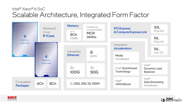 除了PCIe 5.0通道,至强6 SoC还支持多种内存选项,包括4通道和8通道内存配置,以及MCR DIMM高速内存。