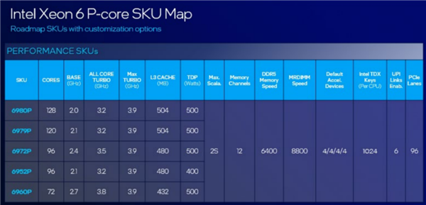 至强6900P系列只有96条,至强6700E系列进一步减少到88条。