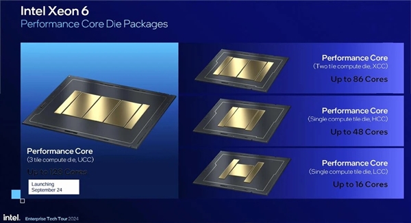 至强6 P系列则有四种计算模块配置:单个小模块16核心32线程、单个大模块48核心96线程、两个大模块96核心192线程、三个大模块128核心256线程(理论上应该是屏蔽了4个核心以保证良品率)。