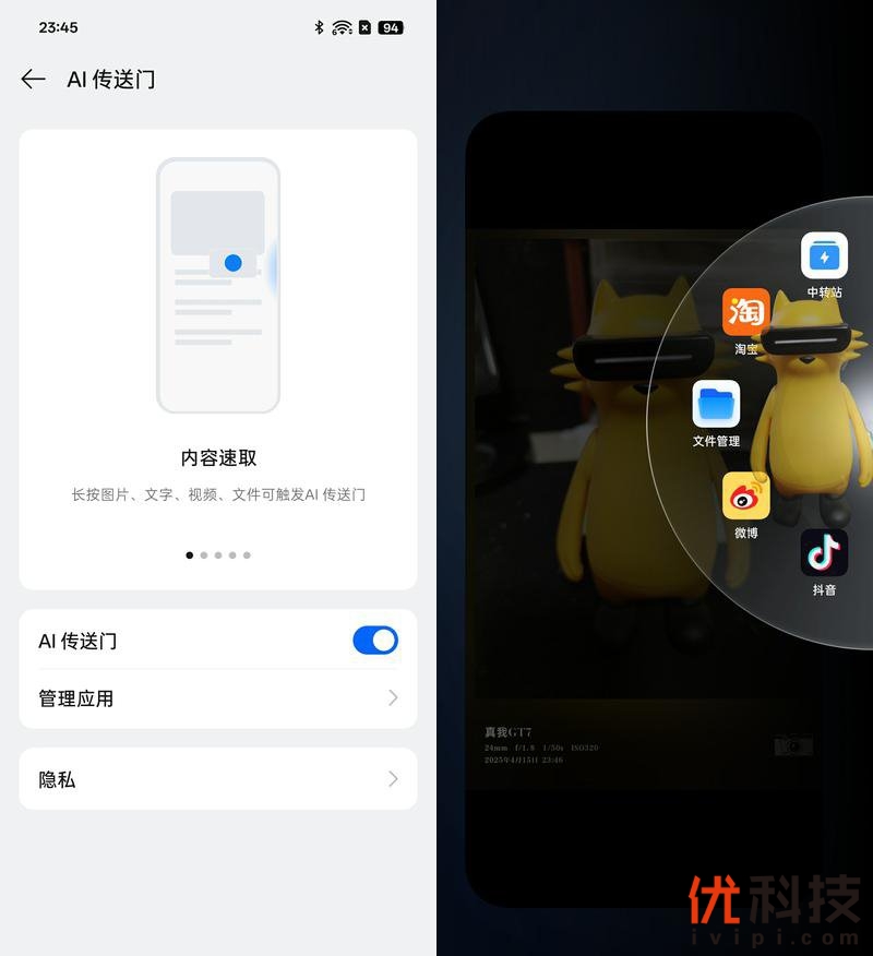 系统内还搭载了非常好用的AI传送门,一键直达,非常好用,仅需两步,一按一拖,更高效的跨应用交互形式,极大地减少了手机的操作步骤。同时交互应用支持自定义选择设定,例如直接发送朋友圈或者微博等等。